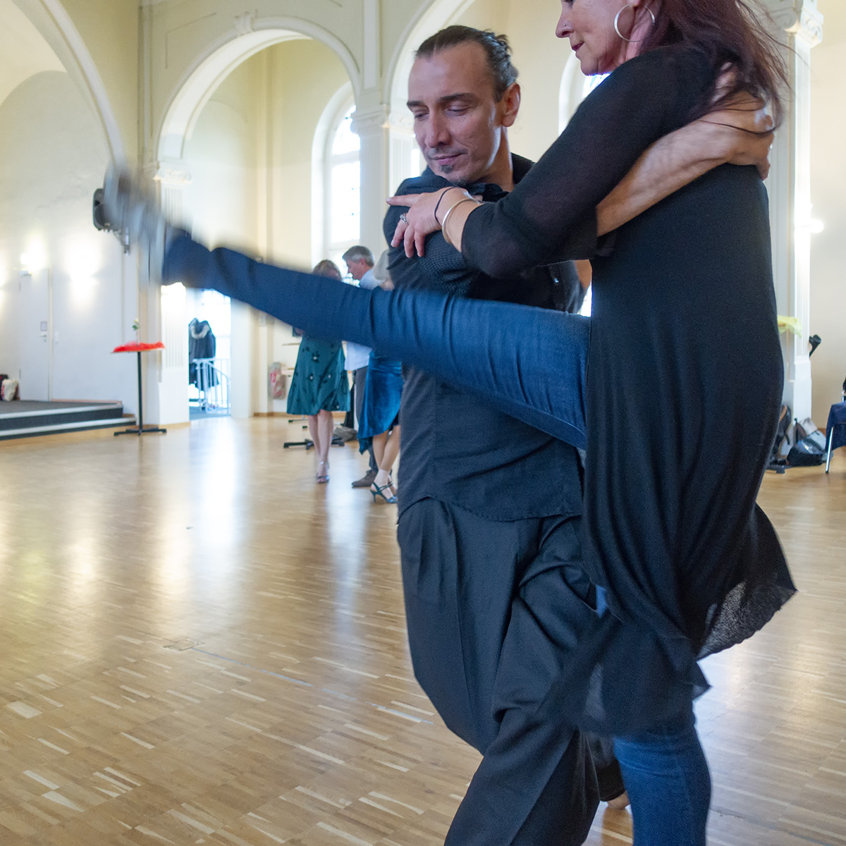 Hohes Bein Auch der DJ César Spengler hat Gelegenheit, in den Orchesterpausen das Tanzbein zu schwingen. Dabei zeigt Piedra Jones (Künstlername Dona Piedra) aus der gleichnamigen Tangoschule in Wuppertal ihr Können auf dem Parkett.