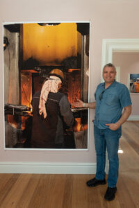 Volkan Coban (Stahlarbeiter) vor einem Porträt von sich