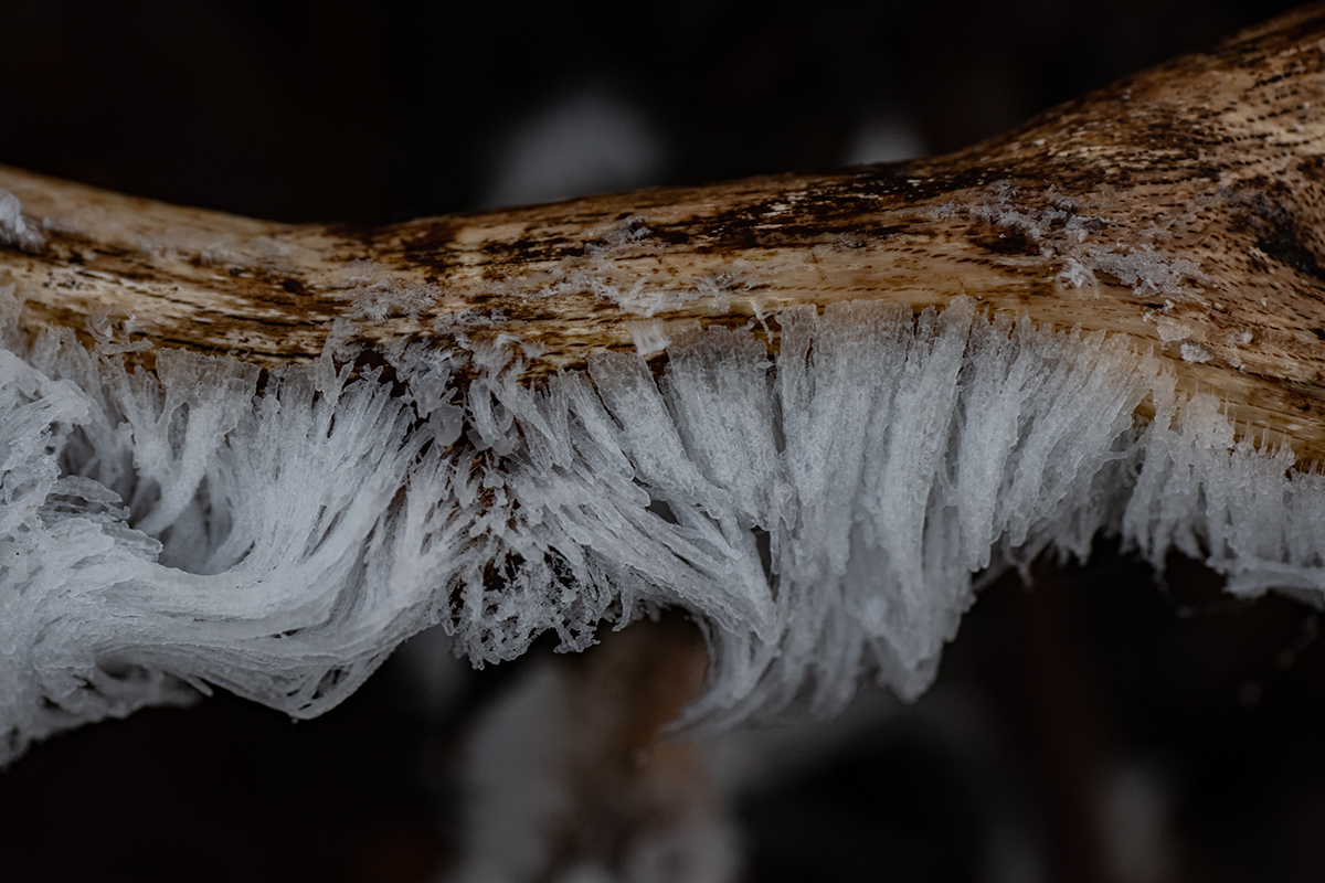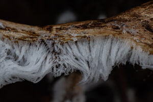 Die Temperaturen knapp am Gefrierpunkt fördern das „Wachsen“ von Haareis an Buchen-Totholz. Wird es etwas wärmer, schmelzen die hauchdünnen Fäden jedoch zusammen.