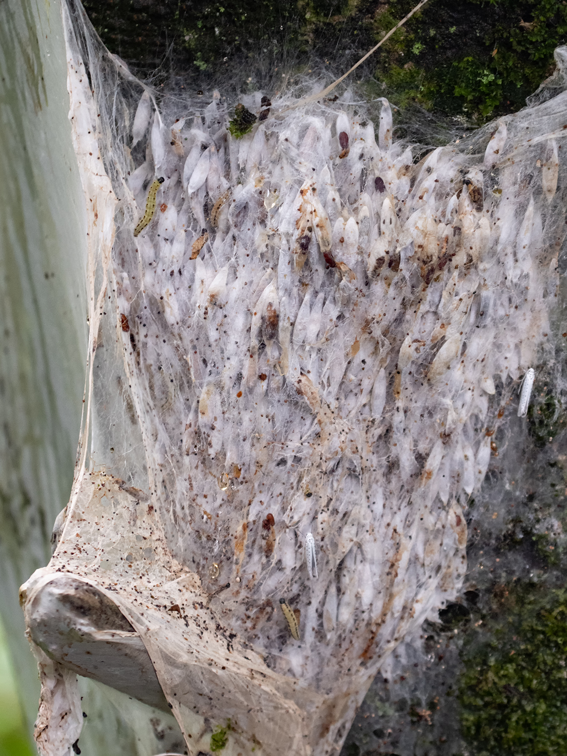 Eingesponnen Es handelt sich um die unter einem Gespinst geschützten Gespinstmotten, die den Baum kahlfressen. In der Regel kann der Baum aber wieder neu austreiben.