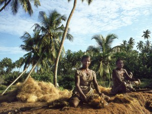 Kokosbearbeitung (Sri Lanka 1977) Von den frischen Kokosnüssen wird das Bastgewebe abgeschlagen., bevor es für Matten oder Ähnliches weiterverarbeitet wird.